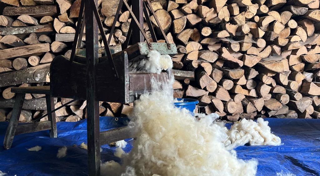 À la suite de cette première semaine, nous avons décidé de n’utiliser que des couleurs issues de la ferme : les couleurs naturelles des laines et un jaune fauve obtenu en teinture grâce à l’écorce de bourdaine (présente dans les tourbières, les brebis raffolent des feuilles de cet arbuste que Johanna taille en têtard pour limiter leur croissance). Chez Lainamac, nous avions accès à l’aiguilleteuse et la machine à feutrer. Nous avons travaillé en collectif pour tenter de raconter le paysage, les plantes, les outils, les brebis, la laine.